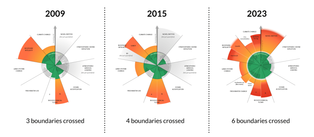 Si en el año 2009 eran 3 las fronteras traspasadas por la humanidad (la interferencia en el ciclo del nitrógeno debido al crecimiento en el uso de fertilizantes, la integridad de la biosfera y el relacionado con el cambio climático), en la evaluación de 2015 se le unía la alteración de los paisajes naturales, que tiene un importante impacto en la biodiversidad y la regulación del ciclo del carbono. En 2023 tan solo 3 fronteras (el adelgazamiento de la capa de ozono, la acidificación de los océanos y la carga atmosférica de aerosoles) no habían sido traspasadas.
